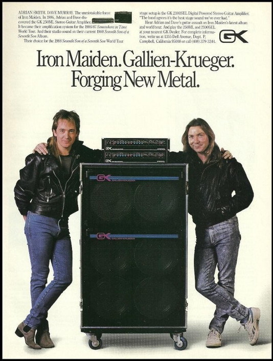 Although Adrian stuck to his base Marshall sound, he and fellow Maiden guitarist Dave Murray dabbled in playing Gallien-Krueger amps in 1986.