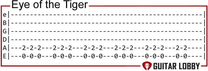 Start with your index finger on the 2nd fret of the A (5th) string and your ring finger on the 4th fret of the D (4th) string. Strum only the A, D, and G strings (5th, 4th, and 3rd) while muting the rest with your palm. Also, note that the song’s riff follows a steady 8th-note rhythm pattern.